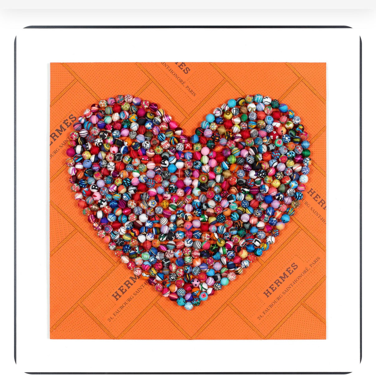 Stephen Wilson heart Pom Pom piece is created as a one of a kind work. A genuine Hermes scarf is up-cycled in this gorgeous piece.